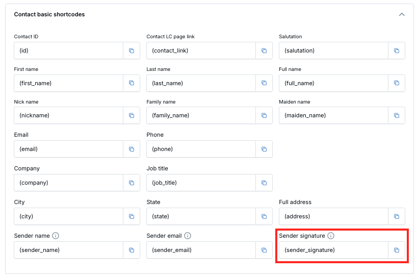 is now available under the Contact basic shortcodes card. This shortcode can be used in your email templates only and will automatically insert the correct signature based on the From email address selected when sending.